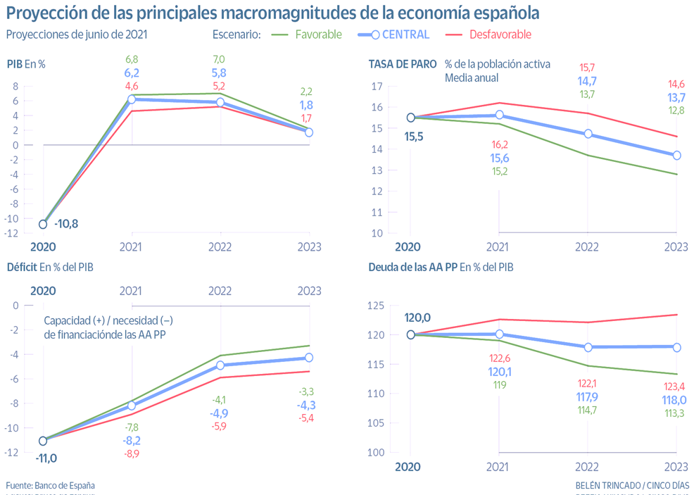 Y en vistas a un futuro próximo y debido a la alta incertidumbre que rodea a la recuperación, el Banco de España ha seguido trabajando con tres escenarios posibles. En el más favorable, la subida del PIB se sitúa en el 6,8% en 2021, en el 7% en 2022 y en el 2,2% en 2023.
