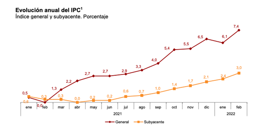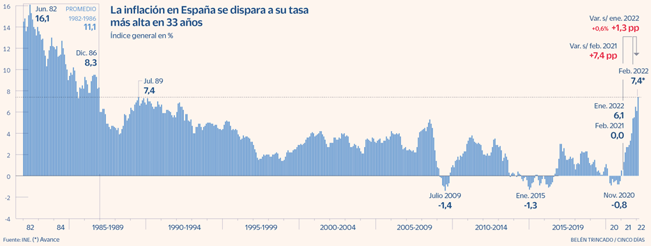 Ante una fuerte escalada de la inflación que se sitúa en torno al 7,5%, el Banco de España ha recortado en 0,9 puntos sus previsiones del PIB situándose en el 4,5%.