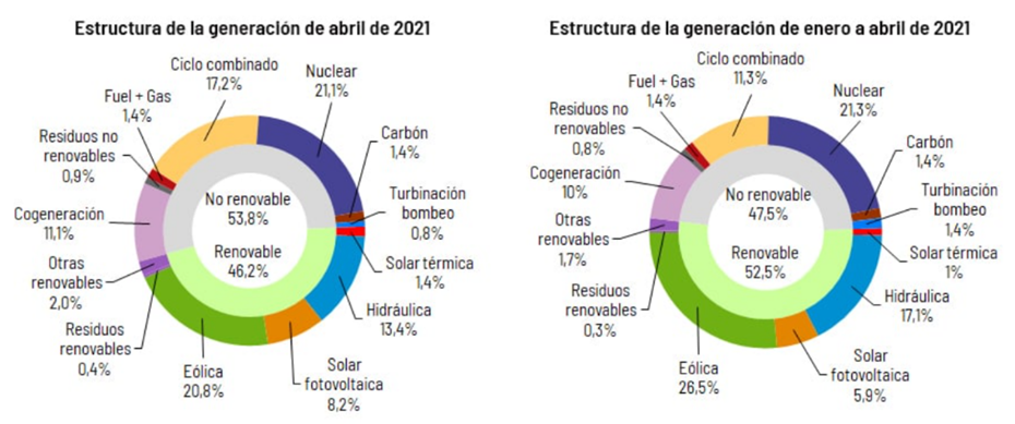 A continuación, un gráfico en el que observamos cómo alrededor de un 50% de la generación de energía procede de energías renovables:
