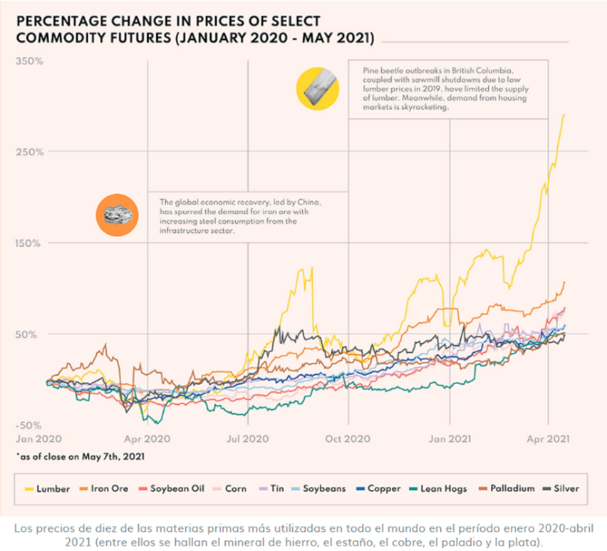 La siguiente gráfica muestra el encarecimiento de diversas materias primas.